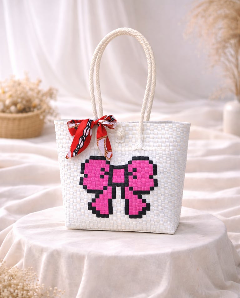 This handmade Jali-style woven plastic bag is crafted from high-quality recycled plastic materials, carefully woven for strength and durability. Featuring a fresh green striped pattern, this bag offers a unique, modern, and eco-friendly look. Perfect for daily use, casual outings, and also suitable as an exclusive handmade souvenir.